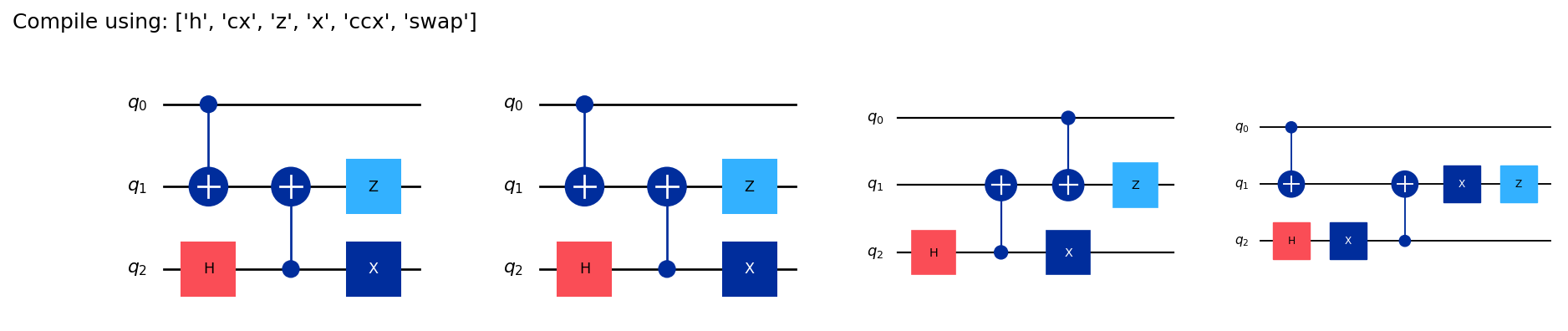 cs[("Compile using: ['h', 'cx', 'z', 'x', 'ccx', 'swap']", 'all'),