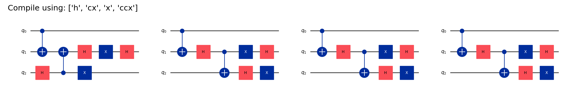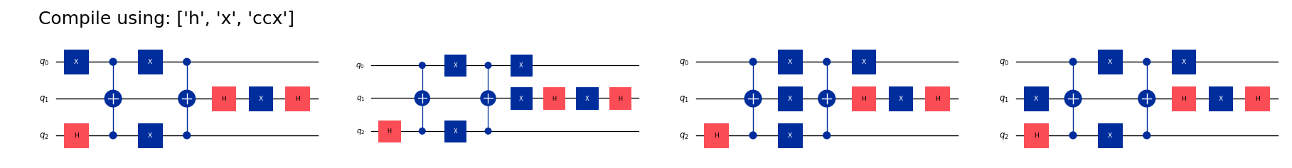 ("Compile using: ['h', 'x', 'ccx']", 'no cx, no z, no swap'),