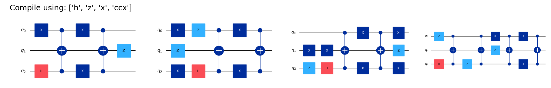 ("Compile using: ['h', 'z', 'x', 'ccx']", 'no cx, no swap')]