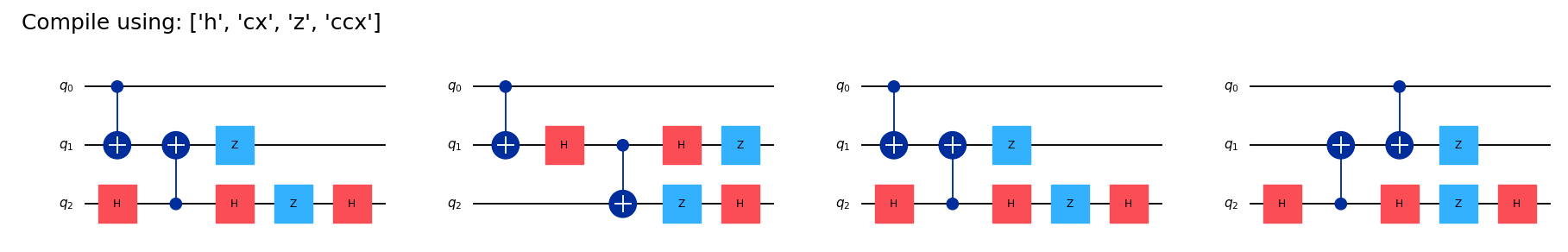 cs[("Compile using: ['h', 'cx', 'z', 'x', 'ccx', 'swap']", 'all'),